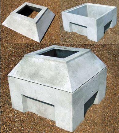 Arqueta formada por dos módulos principales que permite, además, incorporar recrecidos en forma de anillos intermedios de 10 y 20 cm. Sin base, dispone de un rebaje en cada pared lateral por si hubiera que romperse en función del tipo de canalización. No se incluye ni tapa ni cerco de fundición.