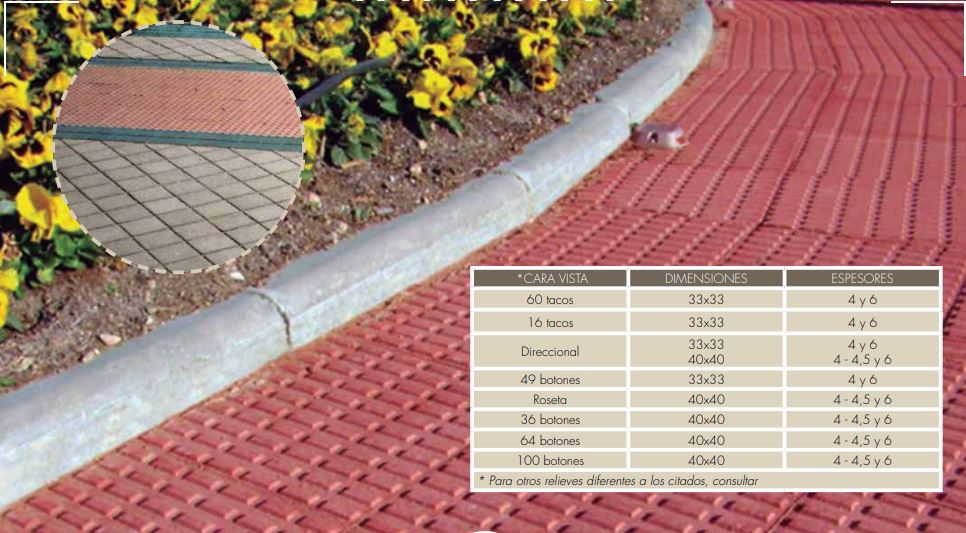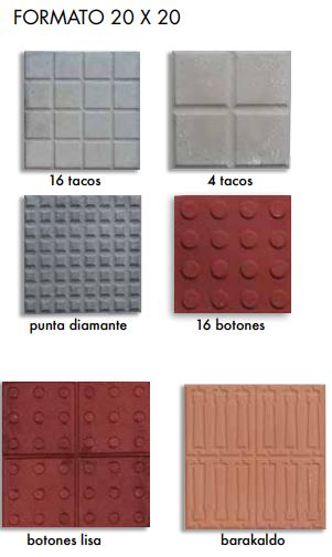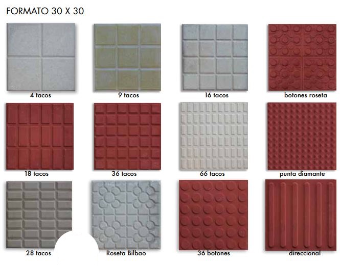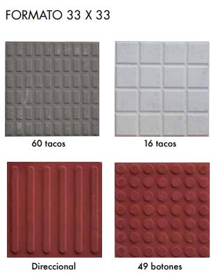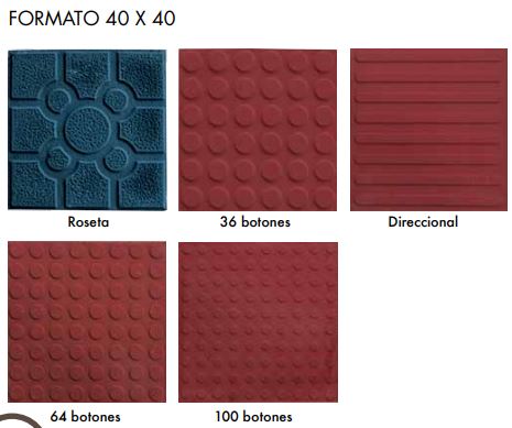 Son baldosas que presentan en su cara vista diferentes formas de en relieves que se adecuan a las necesidades de personas discapacitadas (invidentes).