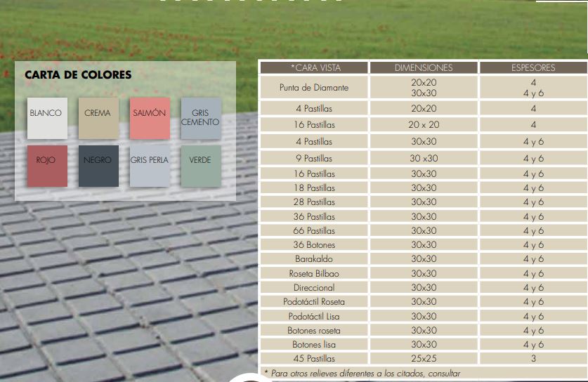 Estas baldosas están disponibles en colores gris cemento, blanco, crema, rojo y negro.